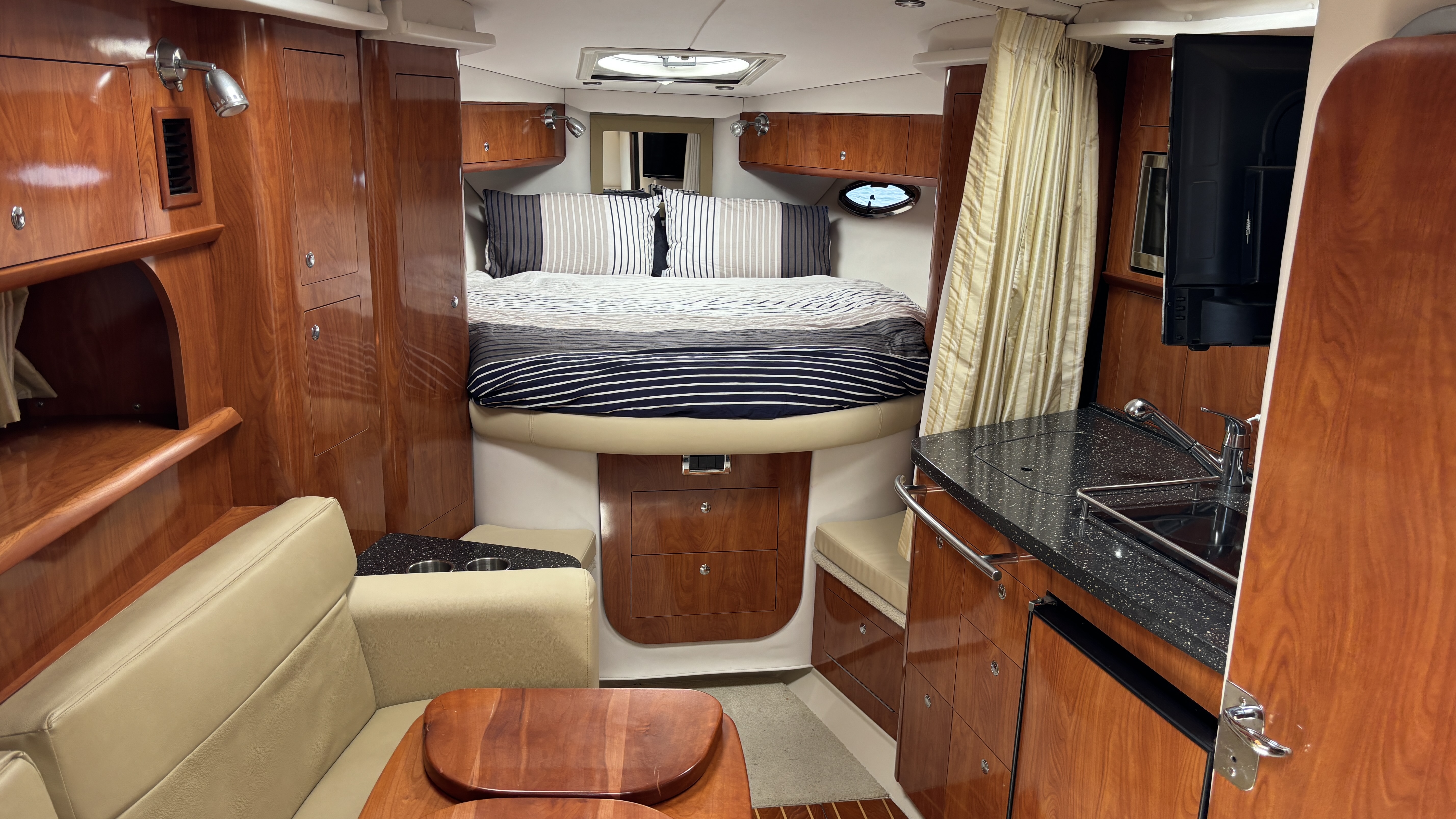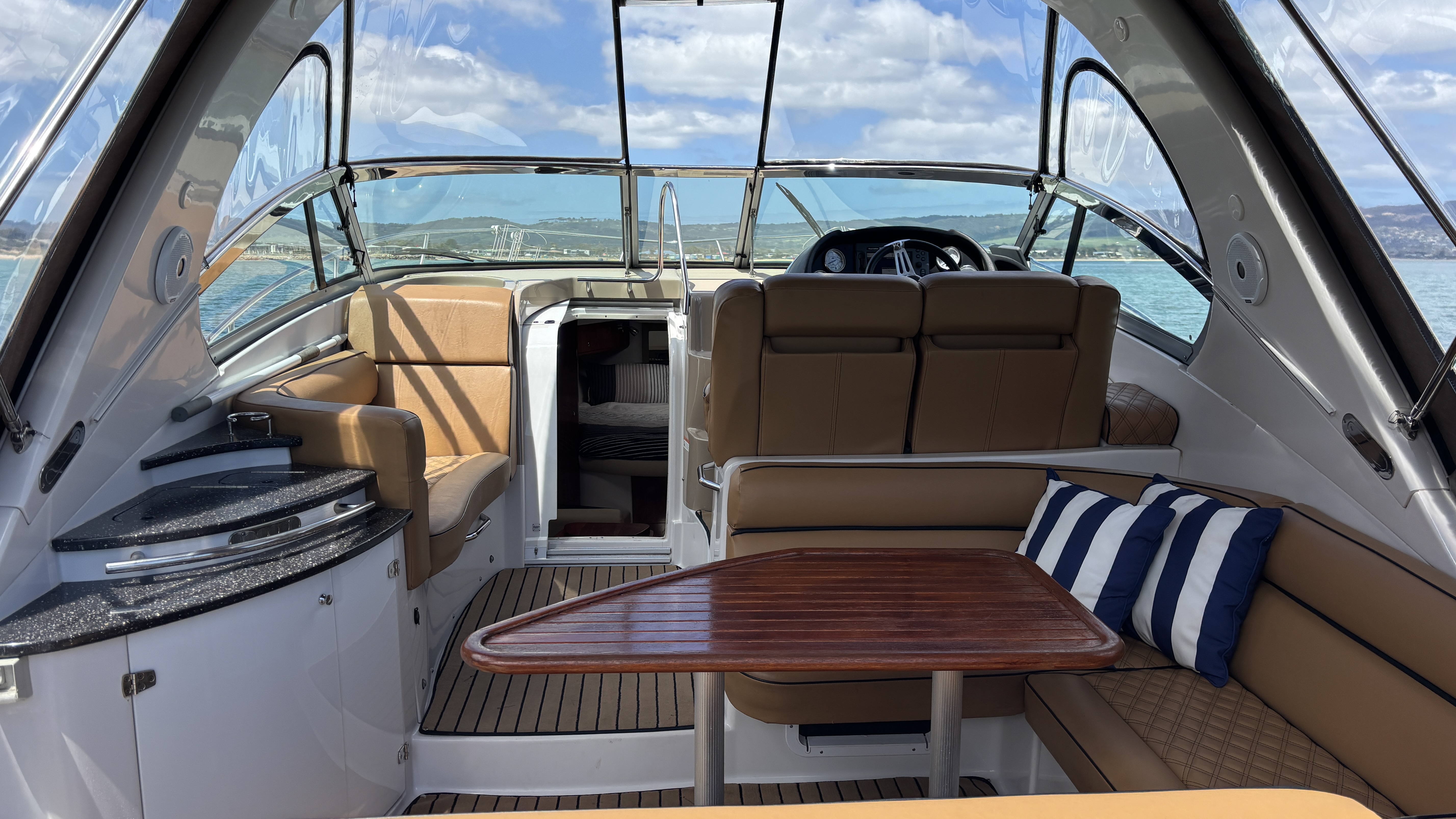 Inside, the Vista is warm, spacious and versatile, offering sleeping for 6–8 people across a forward double berth, aft double berth, and convertible saloon. Cream leather, timber accents and Cruise Air air-conditioning/heating create a comfortable, modern feel. The galley includes a microwave, electric stove and dual fridges, with two TVs and Sony sound systems throughout.