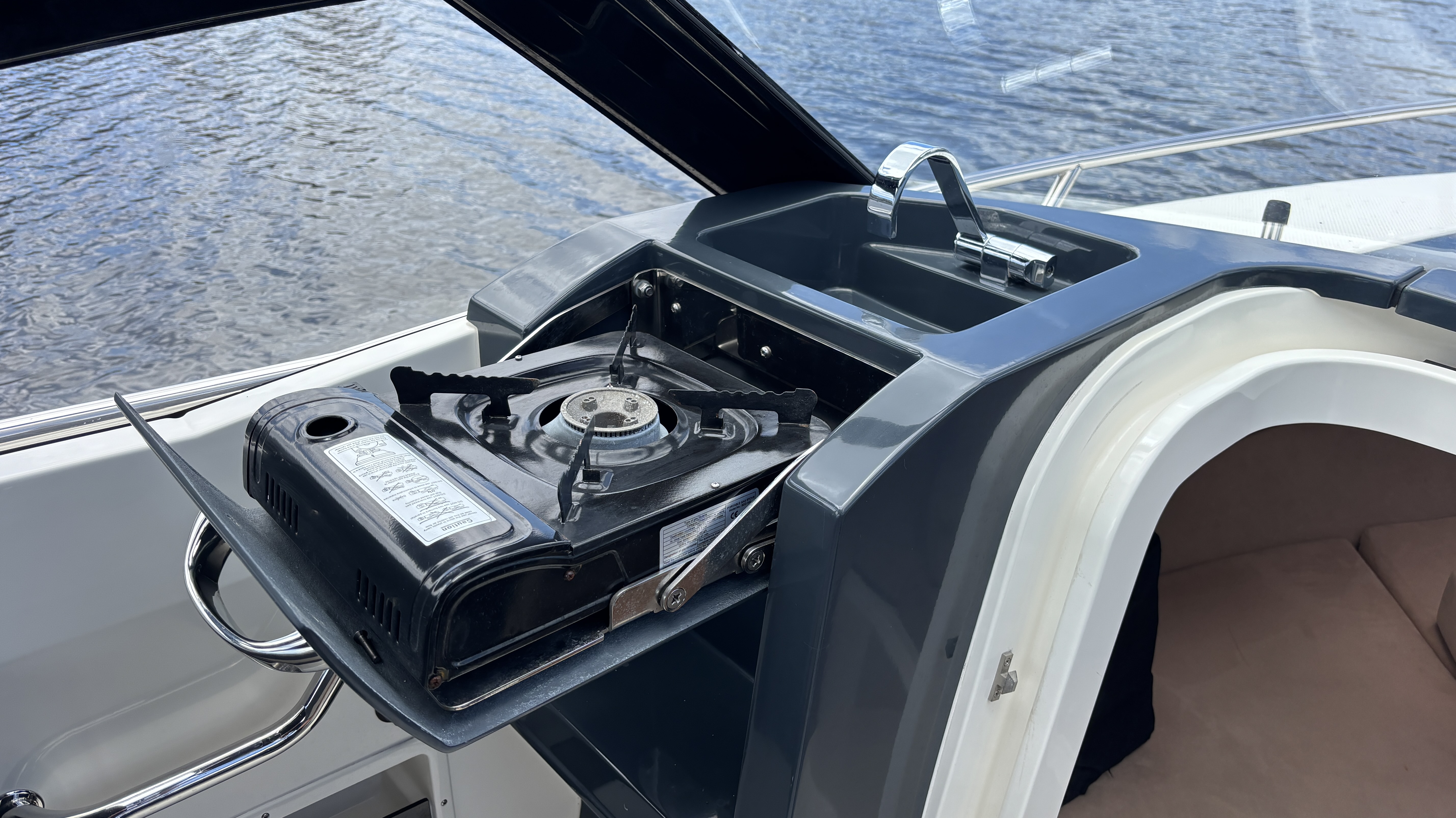 The adjustable aft bench allows you to tailor the layout for maximum comfort and space.Below deck, enjoy a cozy forward cabin equipped with twin berths, a fridge and gas cooktop, and a sea toilet — everything you need for comfortable day cruising or overnight stays.