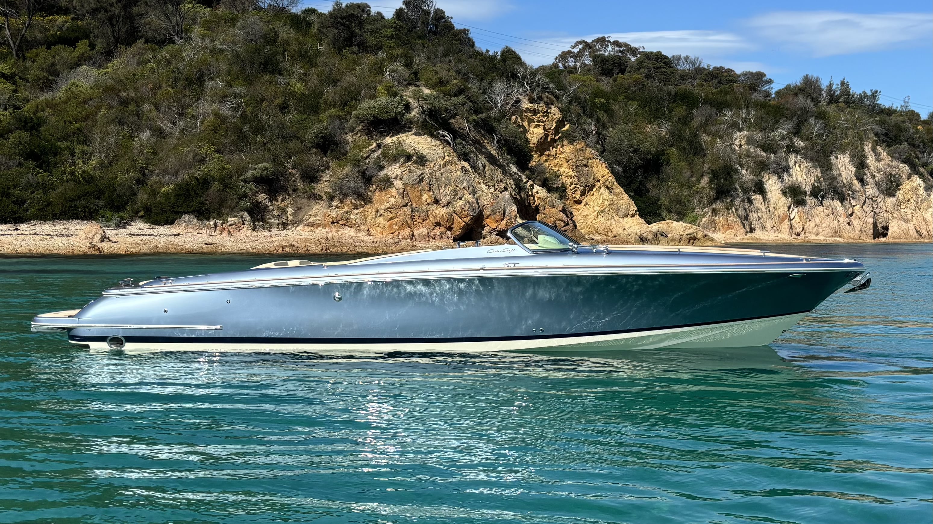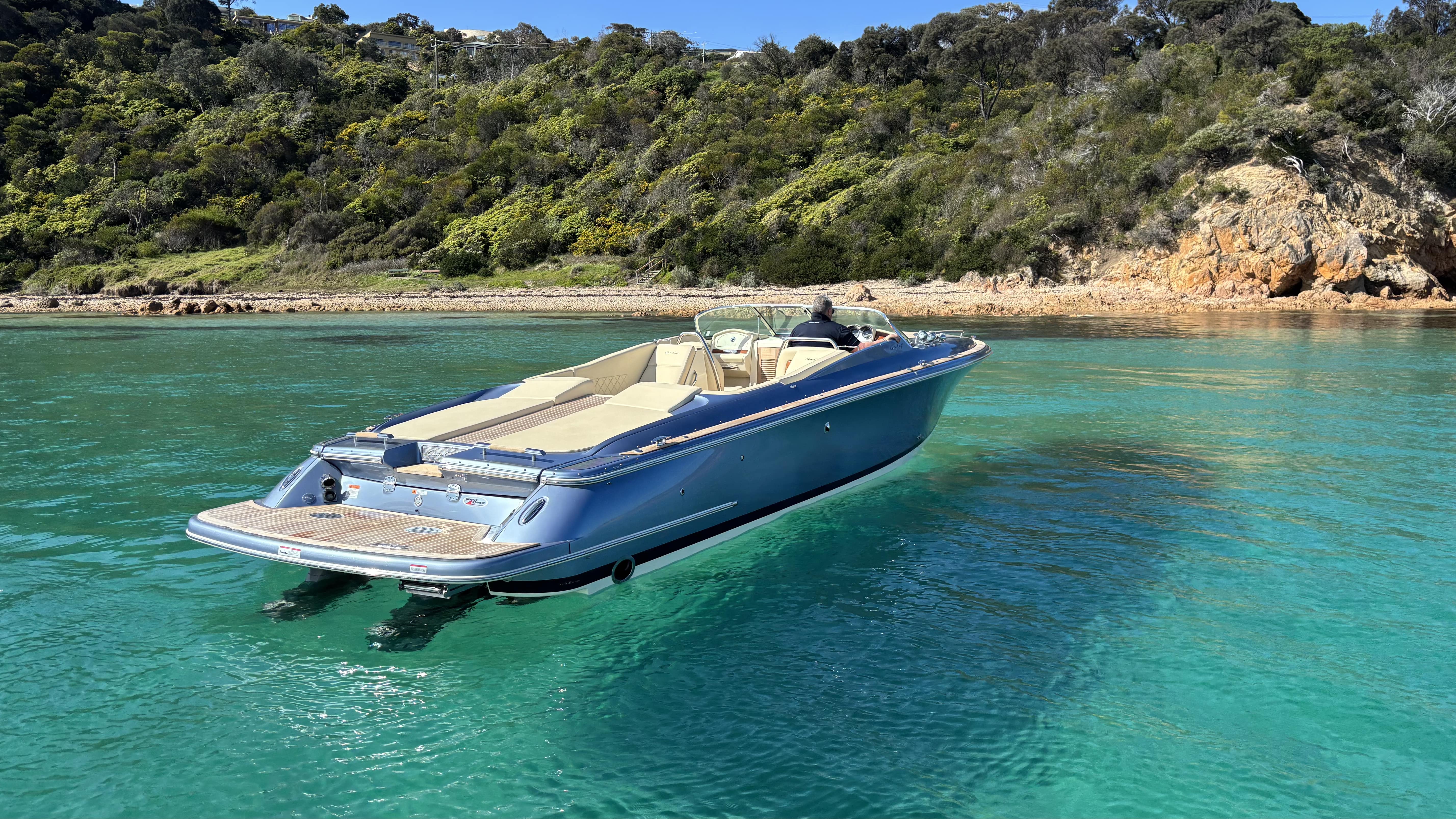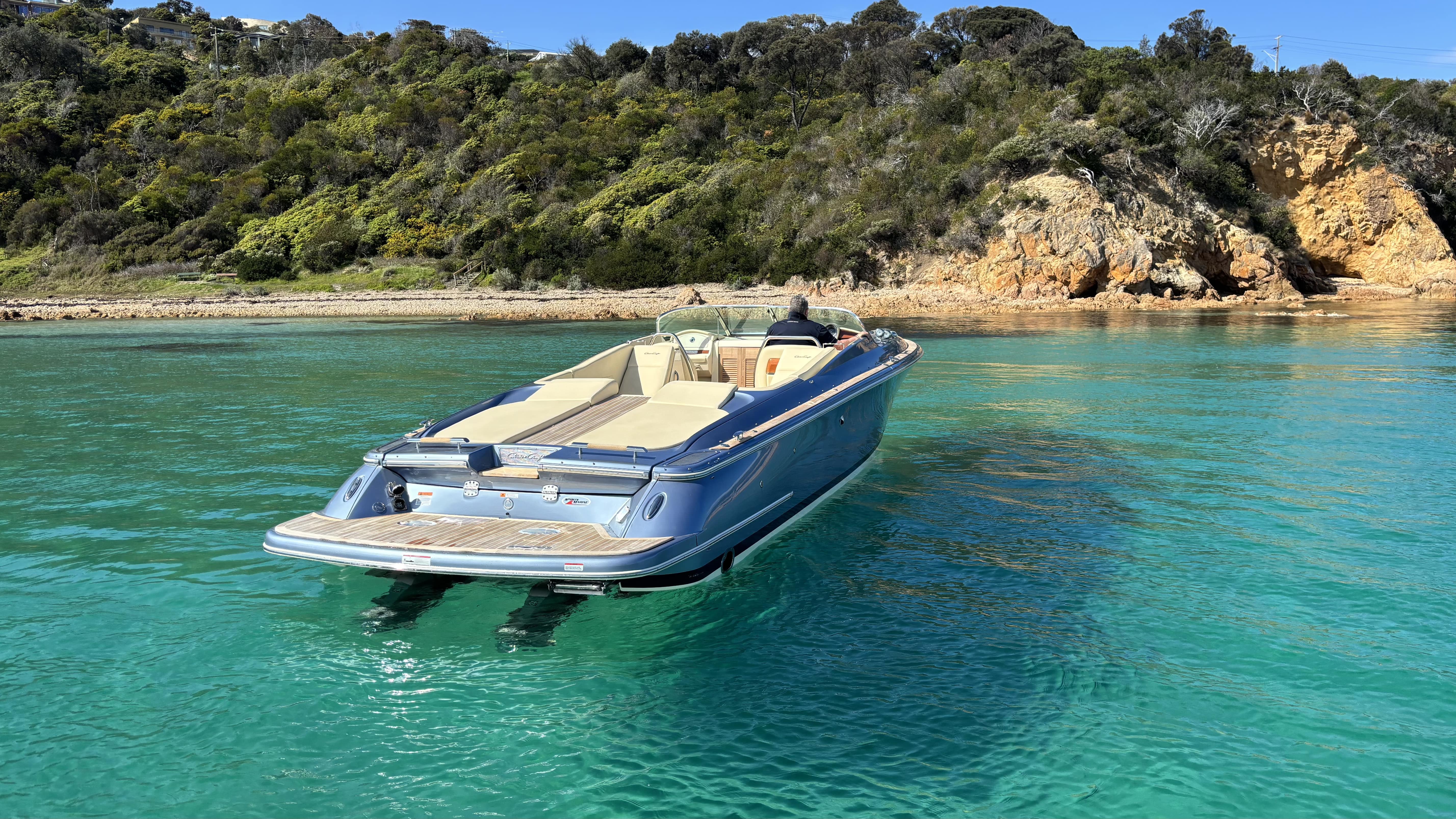 Finished in a limited-edition Frozen Blue hull colour and complemented by twin exhaust out-pipes with quiet or loud settings, the Corsair 34 makes a bold statement wherever she goes. Teak decking throughout and a cream leather interior highlight Chris Craft’s renowned craftsmanship and timeless design.