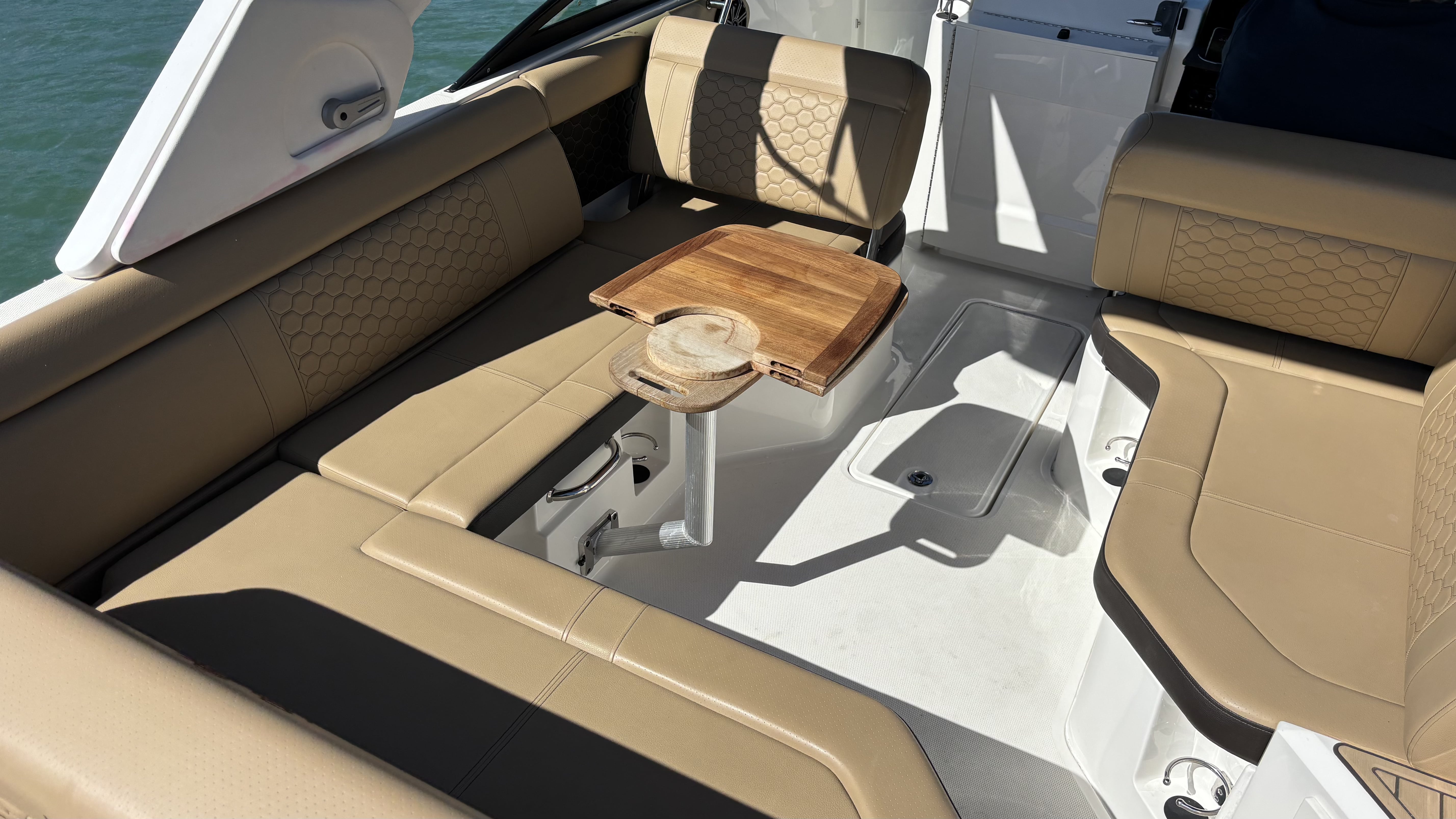 Step aboard and you’ll find spacious seating for up to 14 passengers, a small berth to sleep 1–2, and thoughtful touches throughout — from the SeaDek flooring and teak cockpit table to the Fusion sound system and LED lighting.