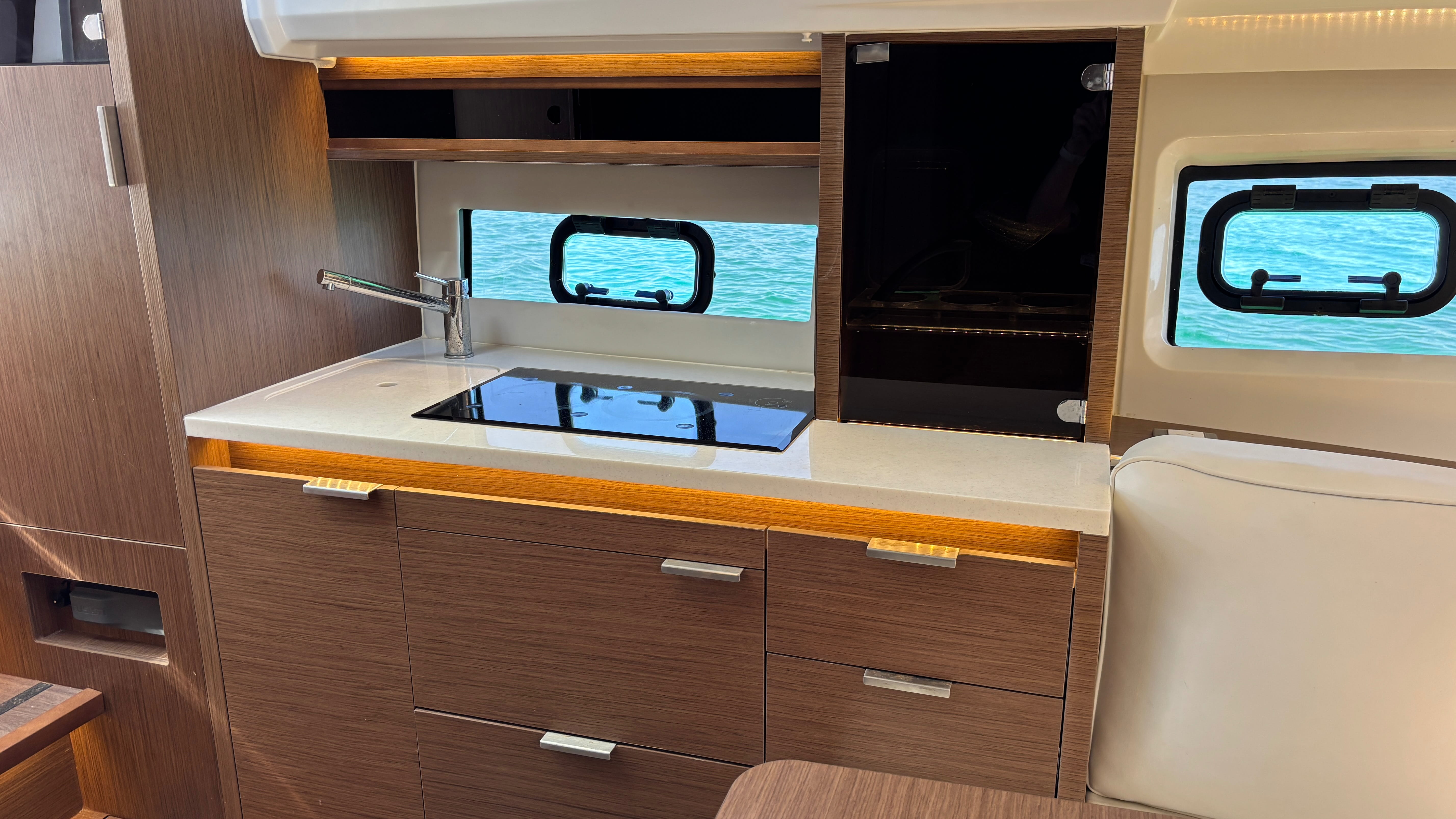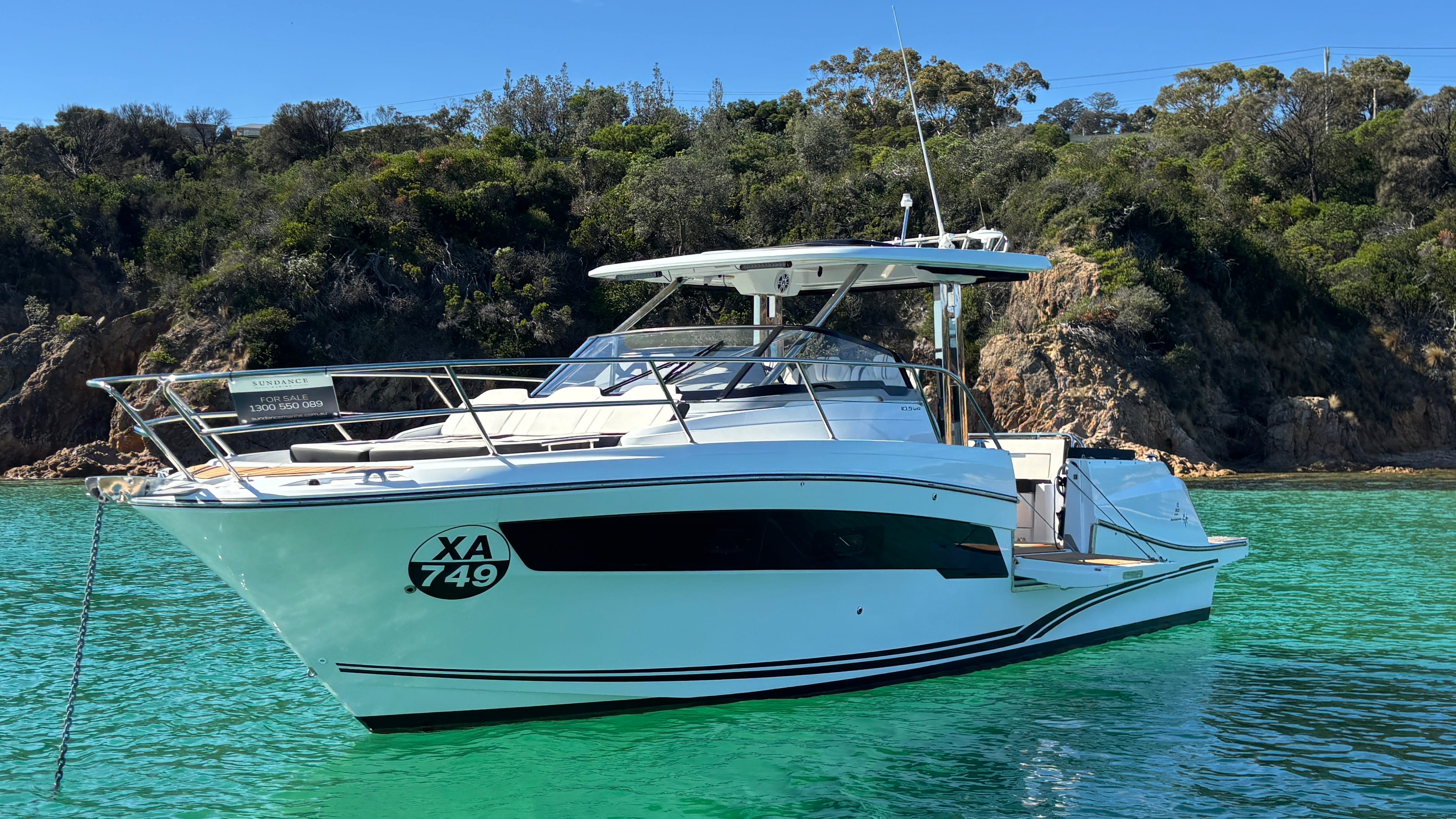 This 2022 Jeanneau Cap Camarat 10.5 delivers the perfect balance of offshore performance, overnight comfort, and entertaining space. Powered by twin Mercury Verado V8 300hp outboards with power steering and low hours, it offers a smooth, responsive ride backed by Jeanneau’s renowned hull design.