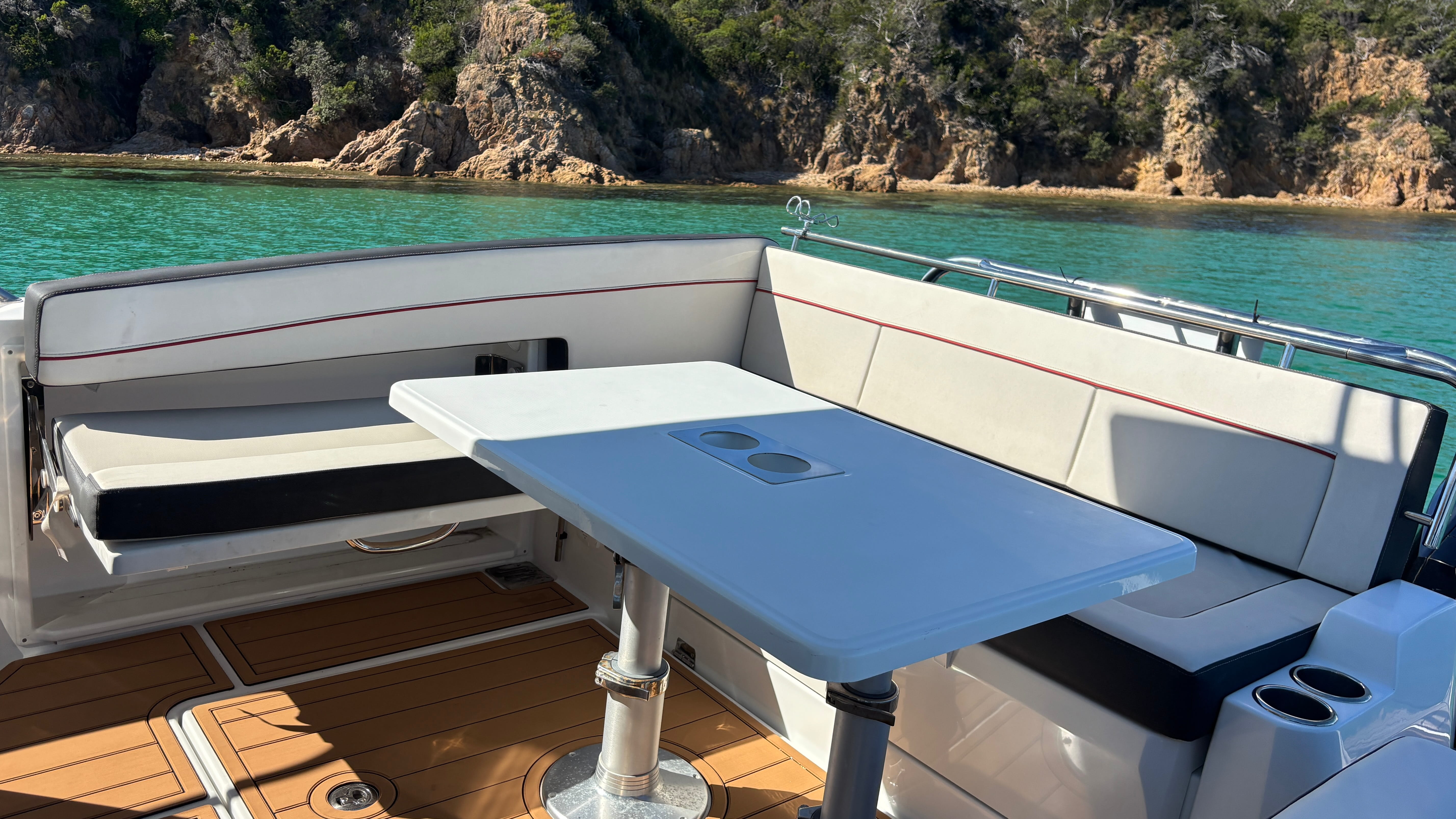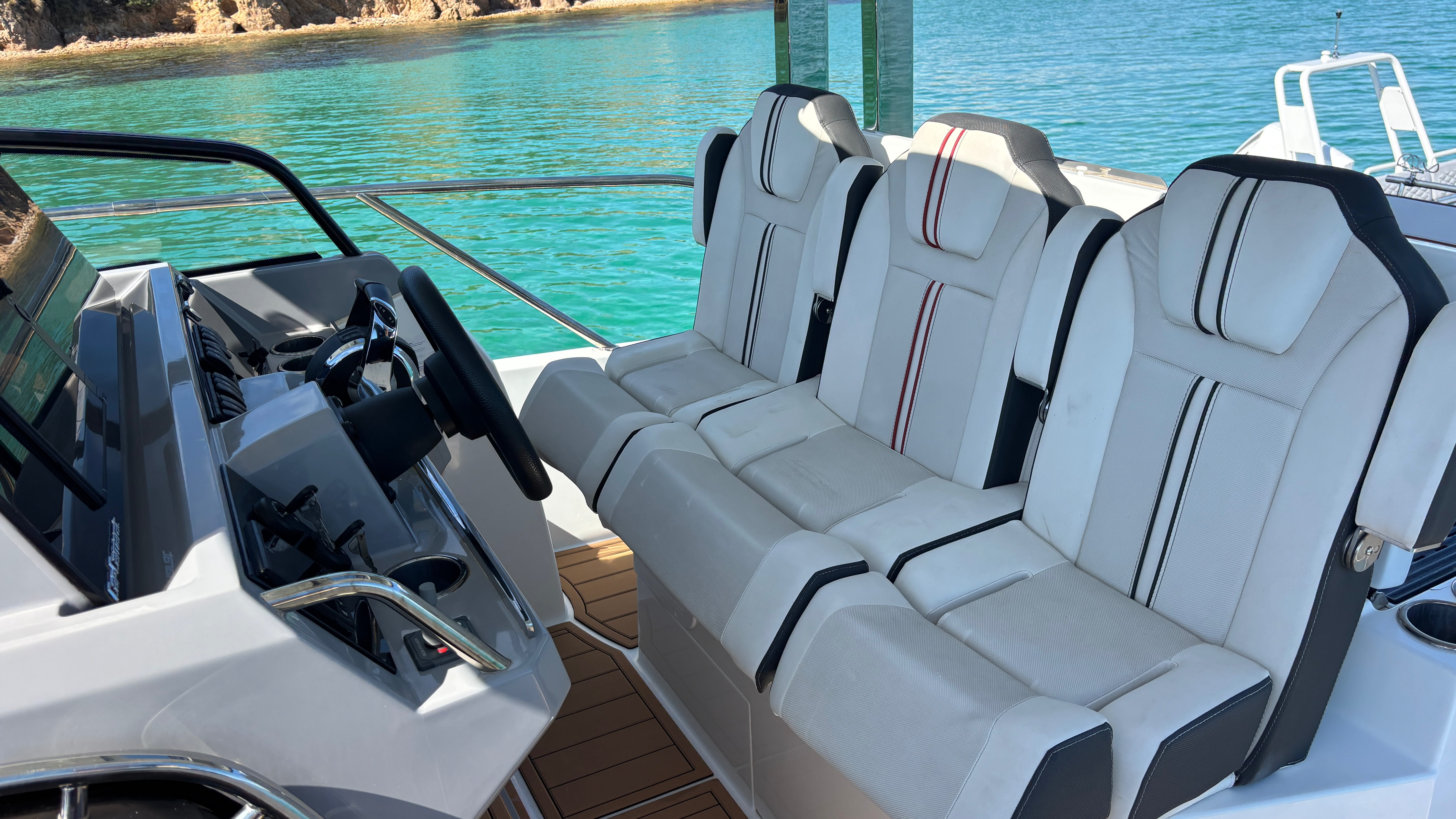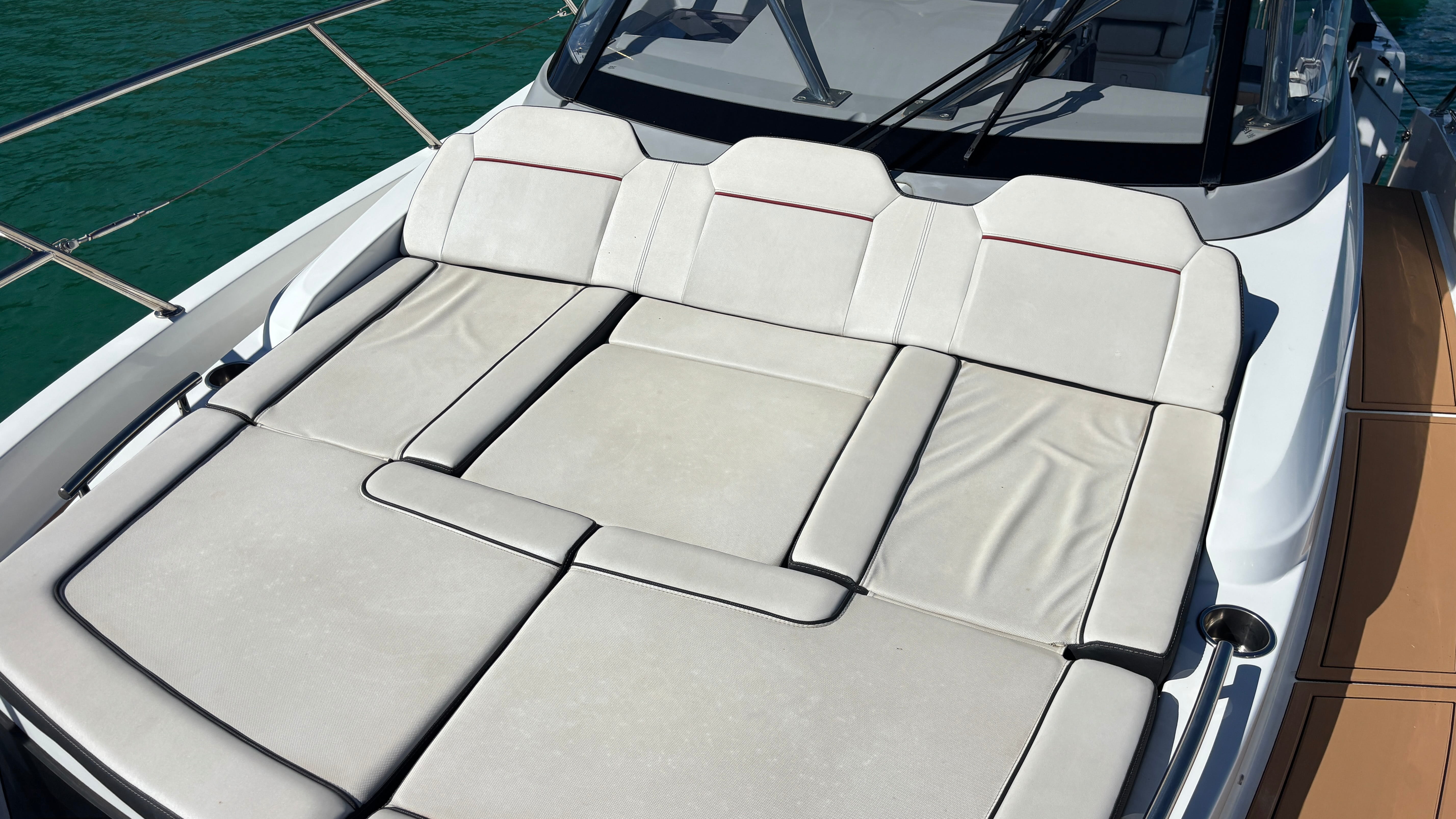 The cockpit is thoughtfully laid out for entertaining, complete with a BBQ setup, spacious seating, and seamless access to the water via the dive platform. SeaDek flooring throughout enhances both comfort and style.