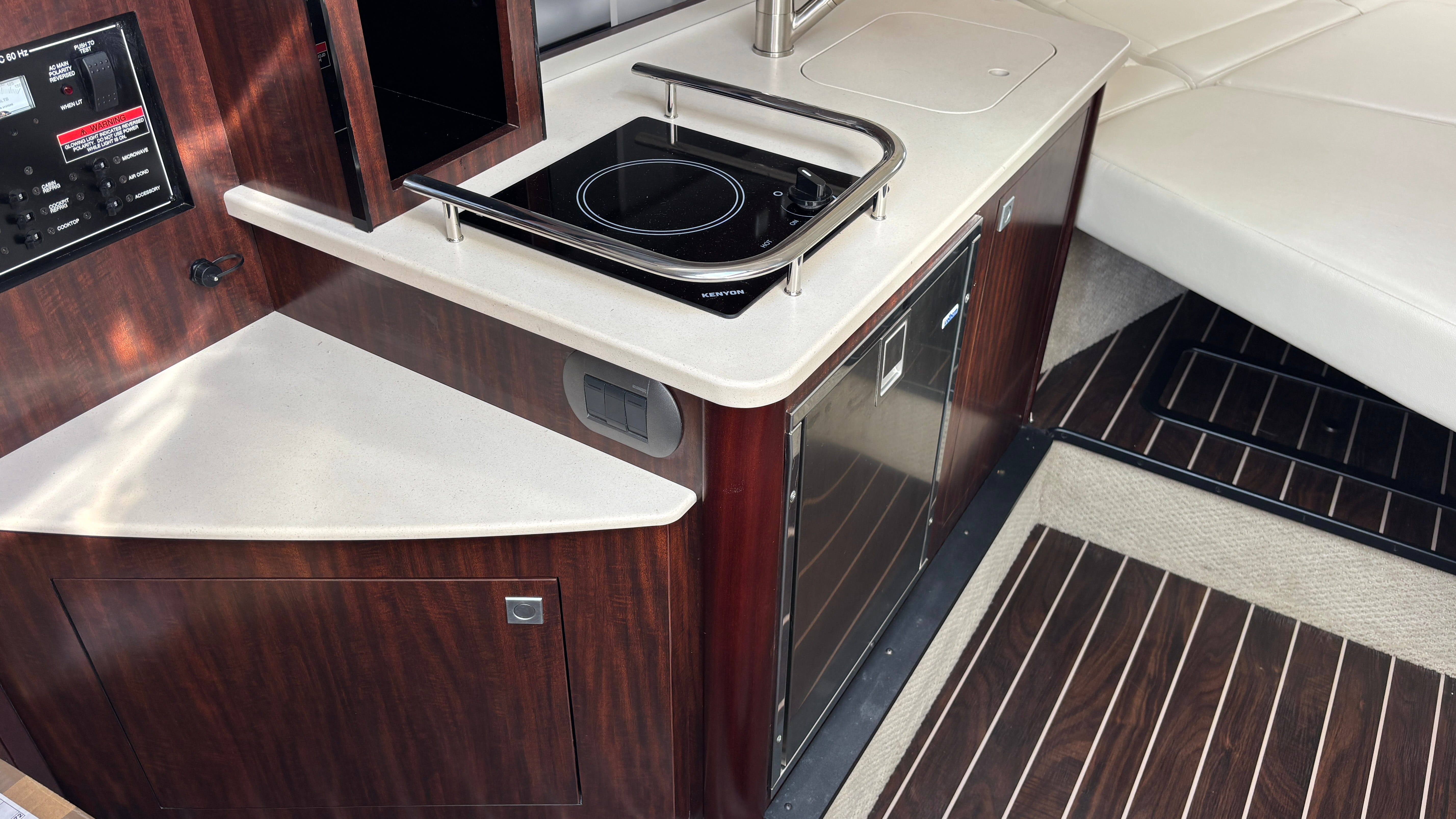 Designed for comfort and ease of use, it features two beds and comfortably sleeps four. There’s both an upstairs and downstairs kitchen, making it perfect for entertaining or extended stays onboard. The electric toilet with holding tank adds convenience for longer trips.